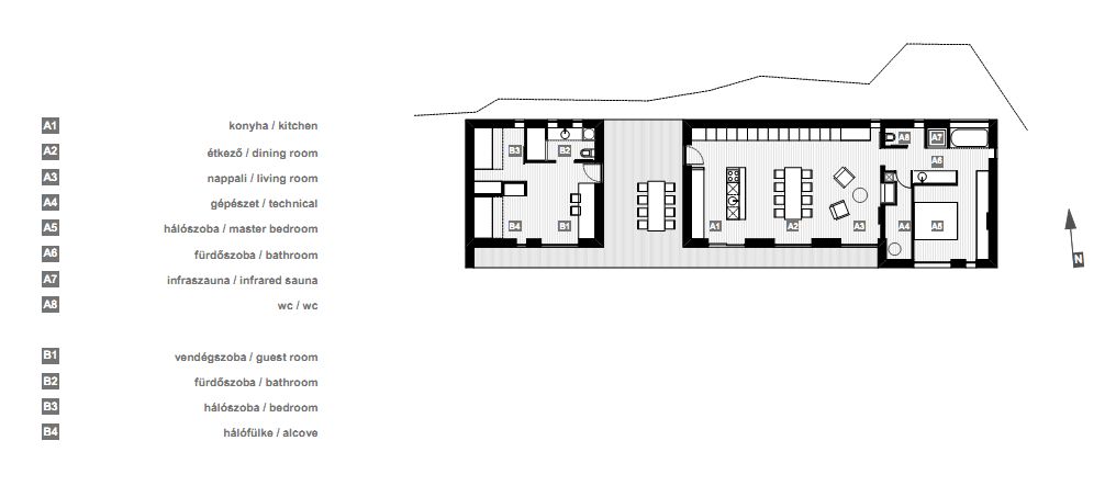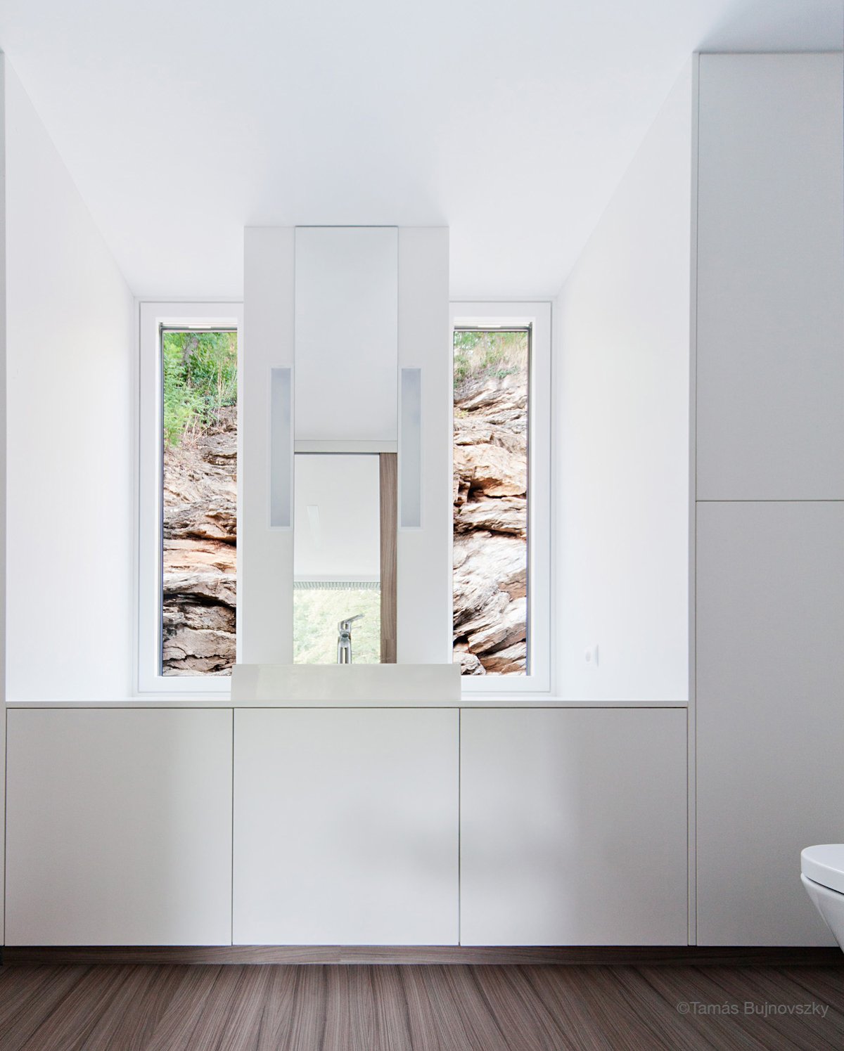 Natural lights and views to the surrounding nature were the most important factors at the arrangement of spaces. The solid and open surfaces of the 110 sqm building react to these elements as well – large but shaded openings towards the best views on the south side, glimpses of the rock from accentuated spots on the north.