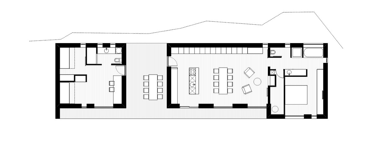 The site had been used as a quarry a few cenutries ago so the exposed rock face was one of the strongest elements of the environment. In order to get enough direct sunlight all-year-long and to stay close to the sculptural cliffs, the building had been placed about 10 meters above the road that runs along the bottom of the valley.