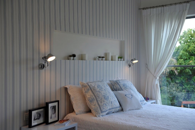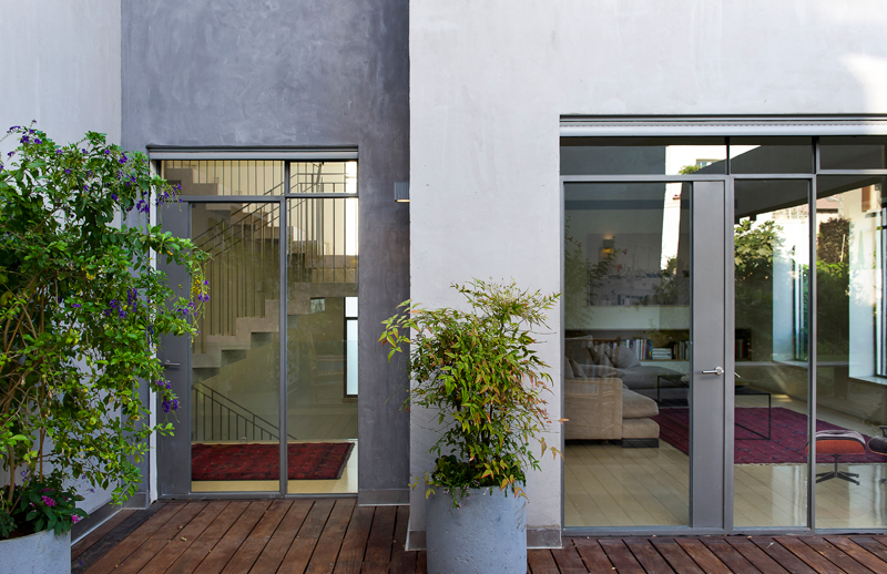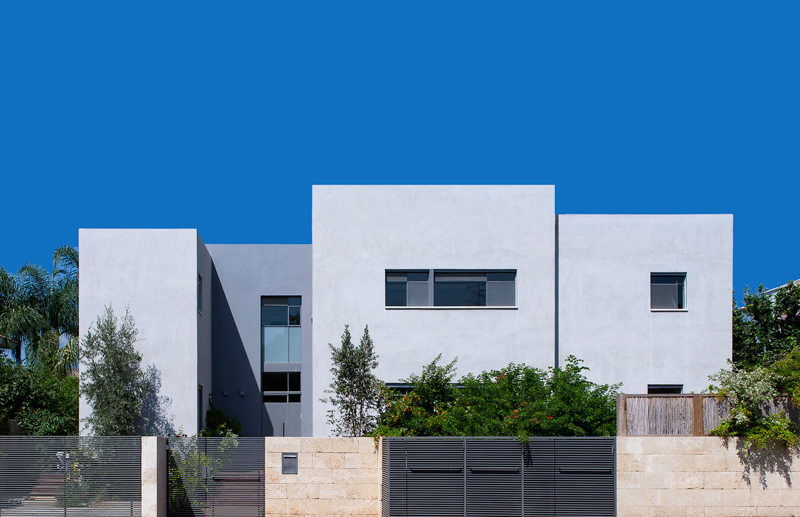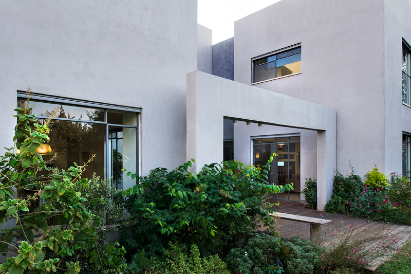 Another problem solved by this scheme is the building code which required red tiled roofs in Ra’anana. Red tiled roof conflicts with the modern nature of the building. Dividing the house into a a “village” of seven “cubes” allowed for smaller roofs and moderate slopes, thus the roofs are completely hidden and not seen from the street level nor from the garden.
