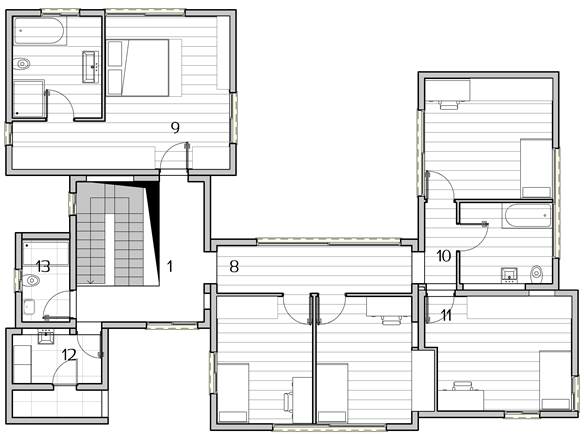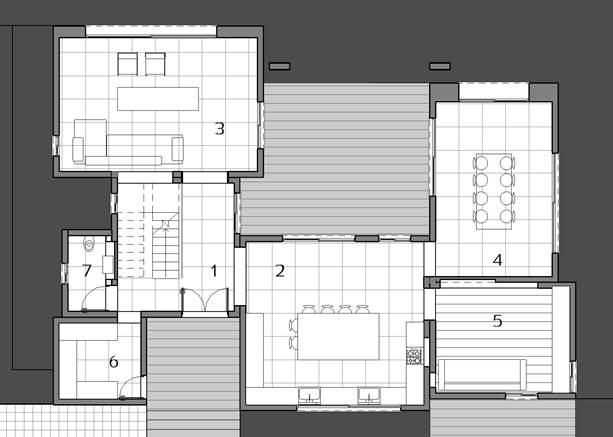 The house consists of seven “cubes”; each one of a different height, each one contains two functions – one on each floor.