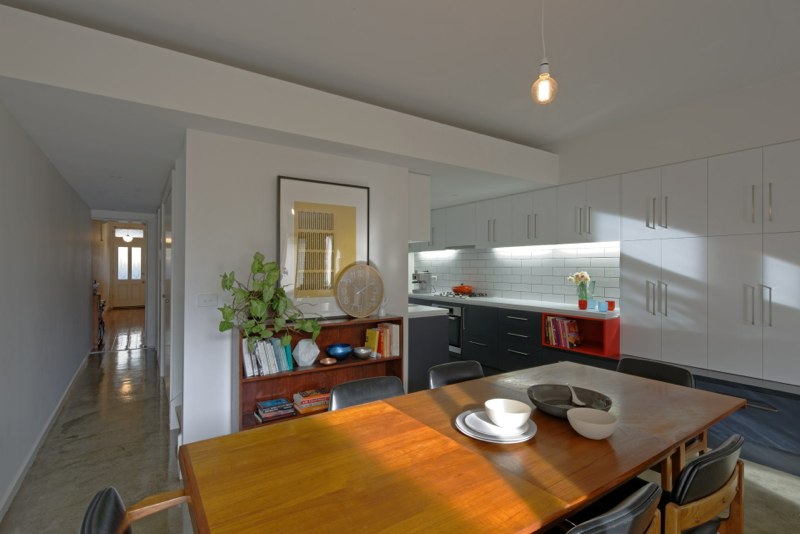 Compact alteration/addition of a terrace house in Carlton with east-west orientation and limited connection to the rear yard. The brief called for new bathroom, laundry, living, dining, kitchen, master bedroom and ensuite.