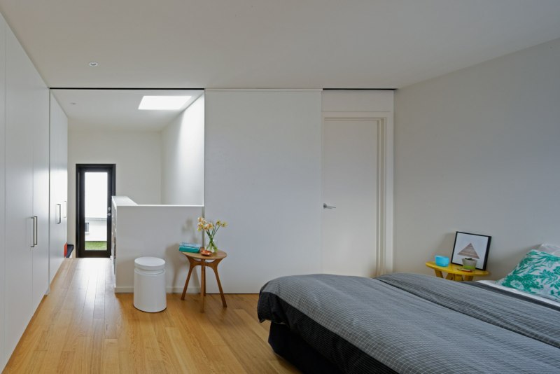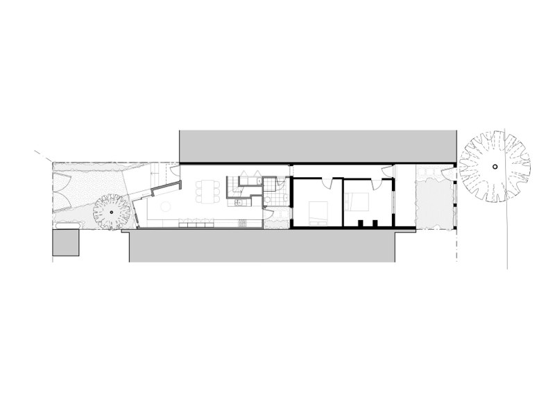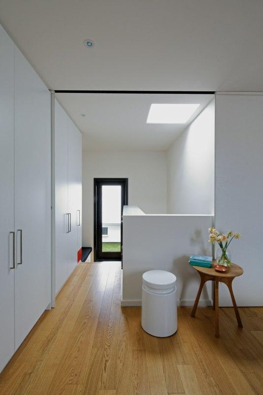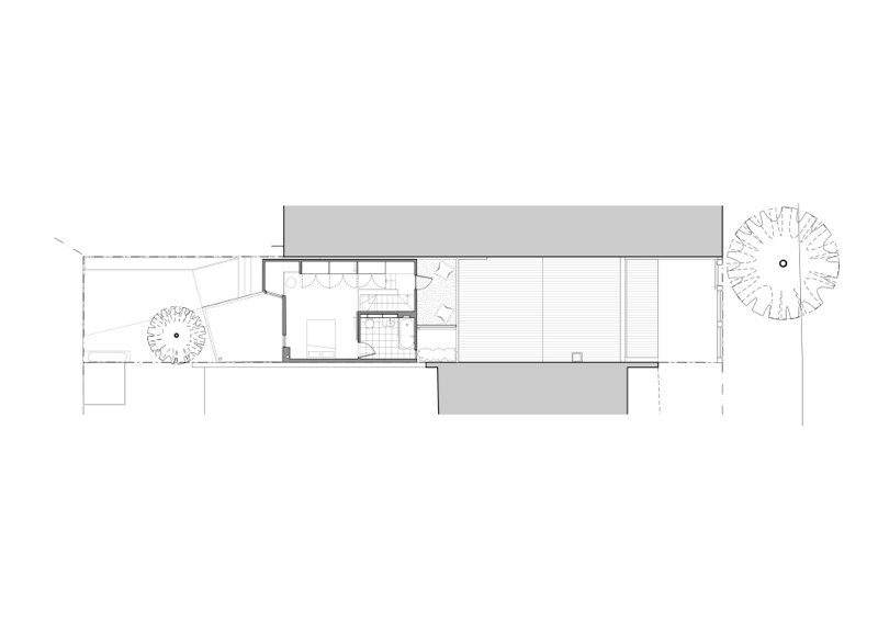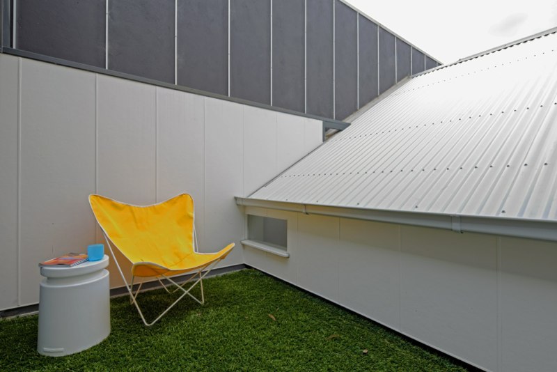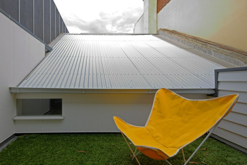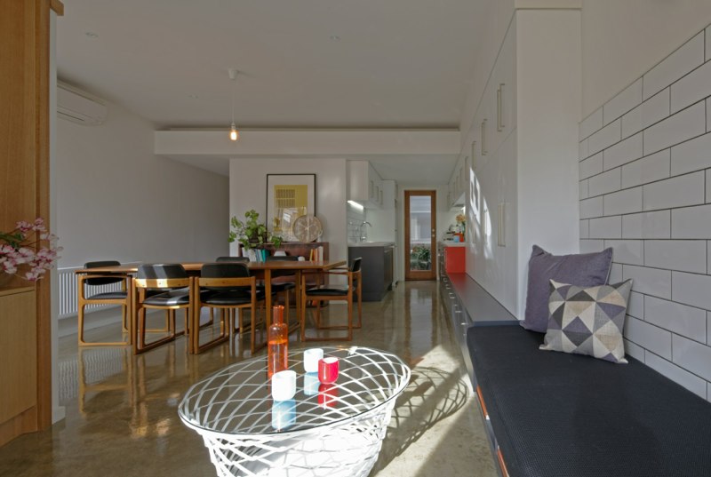 The insertion of a light court and roof deck over the new bathroom at the stair landing brings in diffused light and allows for cross ventilation. The daybed at the apex of the tapering living space also connects with the north facing concrete seating plinth outside.