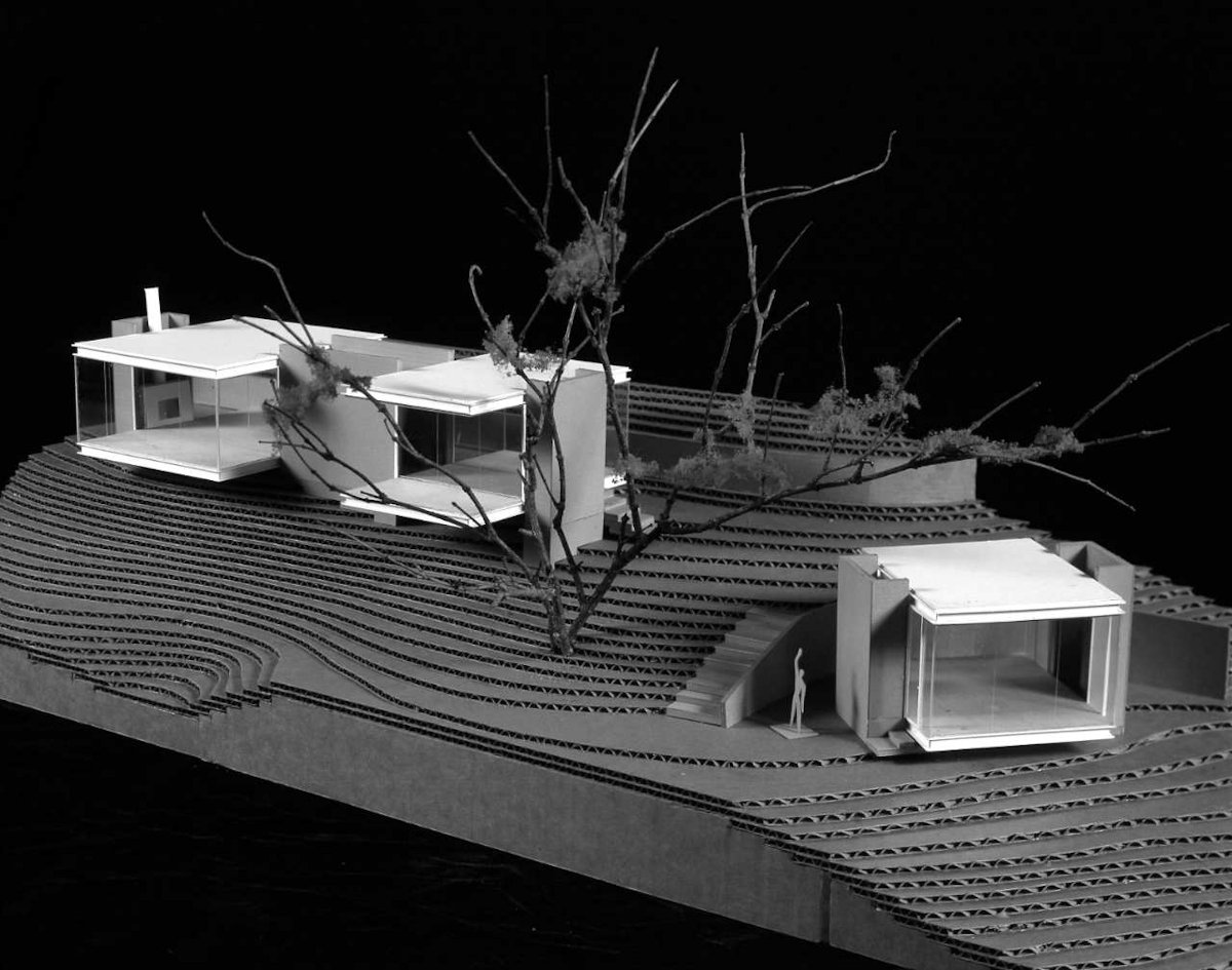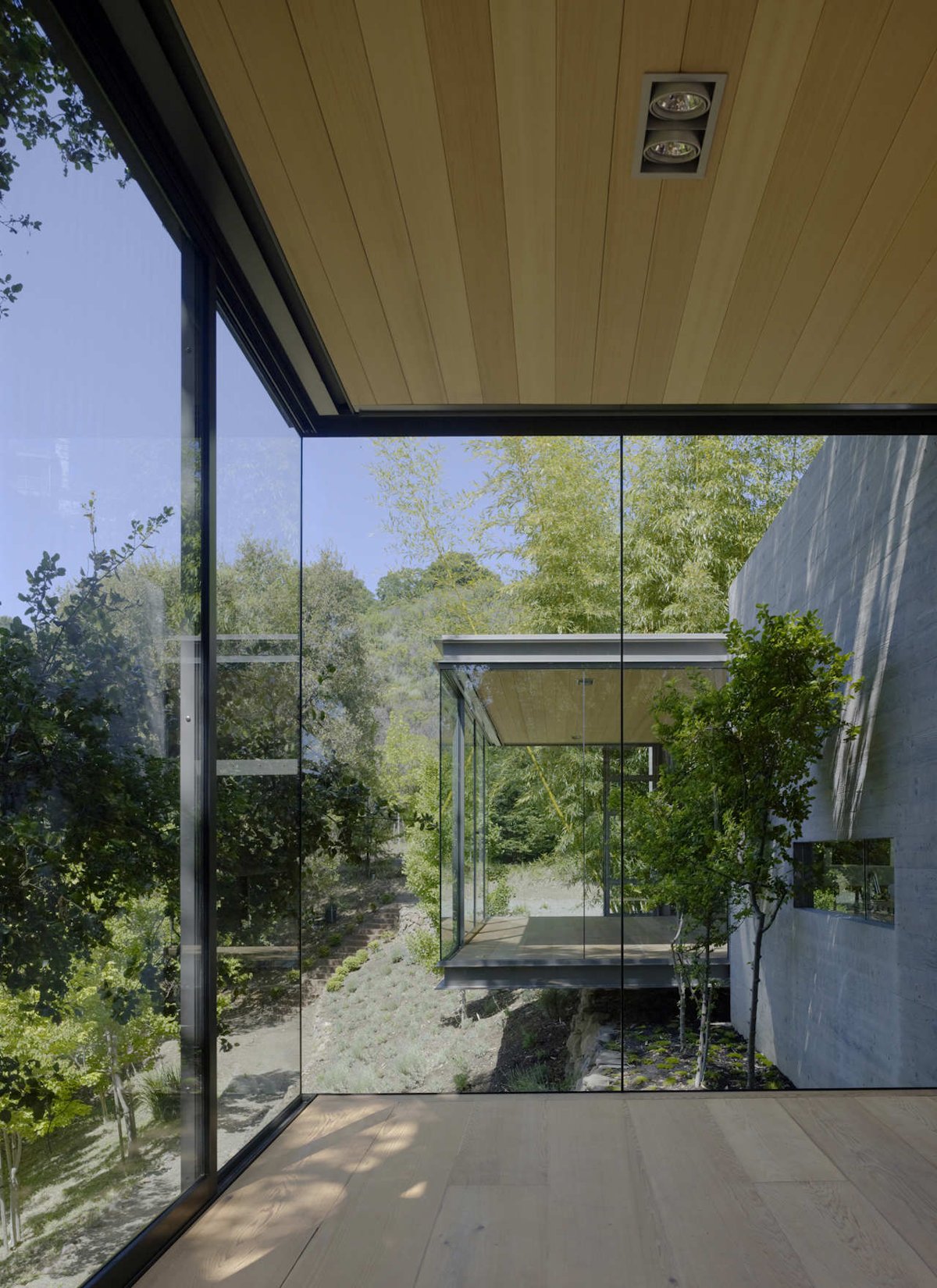 Each tea house is designed as a transparent steel and glass pavilion, hovering like a lantern over the natural landscape. Cast-in-place concrete core elements anchor the pavilions, supporting steel channel rim joists which cantilever beyond the cores to support the floor and roof planes. With its minimal footprint, the design treads lightly on the land, minimizing grading and preserving the delicate root systems of the native oaks.