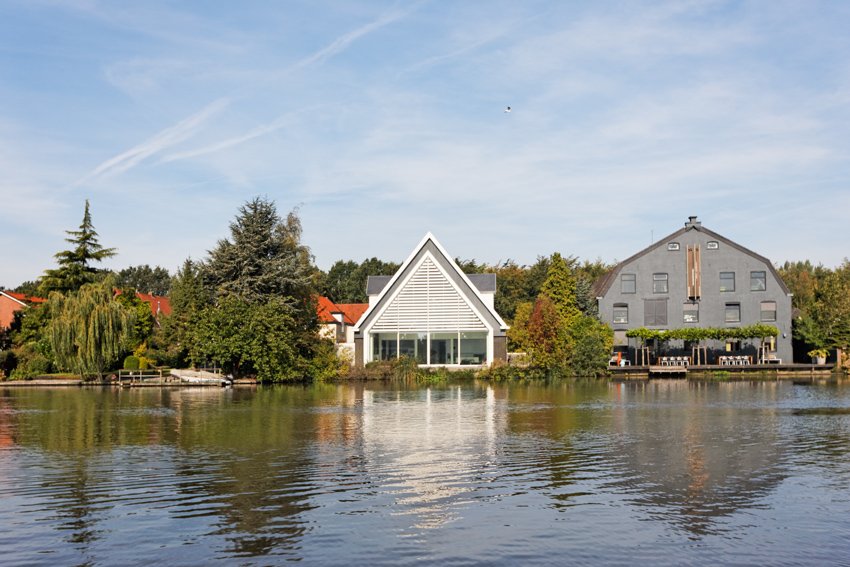 On the back-side of the original church was the choir. A smaller and lower volume than the actual church. With its back facade directly situated on the bank of the river De Rotte. The original volume of the choir is replaced by a modern volume, with the same measurements but much shorter and with the back facade completely out of glass. The formerly ‘transept’ of the church (cross-ship) is laid open now. And is designed as an immense void, where the whole original church can be seen. The new glass-façade opens the church to the river and gives a magnificent view off the landscape. The transept now functions as a buffer between the outside and the private house.