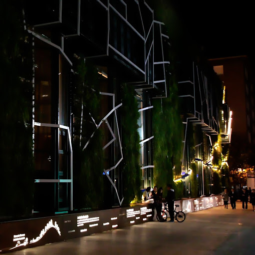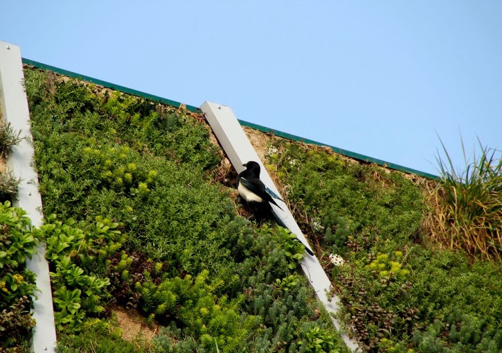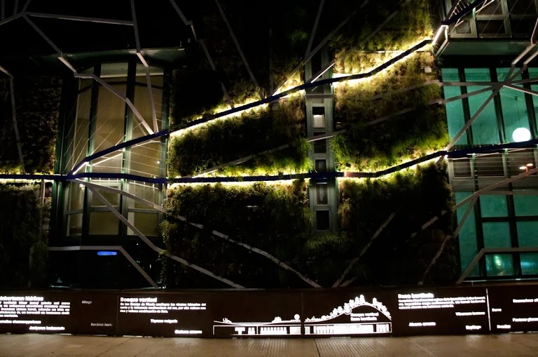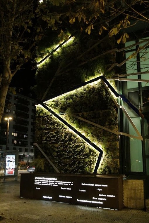 The river-profile that structures design vertical forest is illuminated at night by low-power LEDs. This creates an unique atmosphere for a walk in the center of Vitoria- Gasteiz.The corten steel base not only provides educational information on the garden, also becomes a space for relaxation and conversation, a bench in a Vertical Park.We were surprised how quickly nature breaks through the vertical garden, thanks to native plants it has been colonized by all kinds of insects and animals, the birds have quickly appeared, here you have a picture of a magpie foraging.